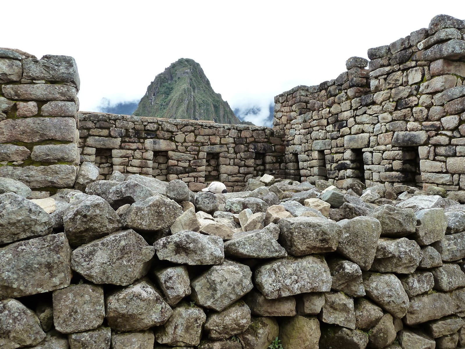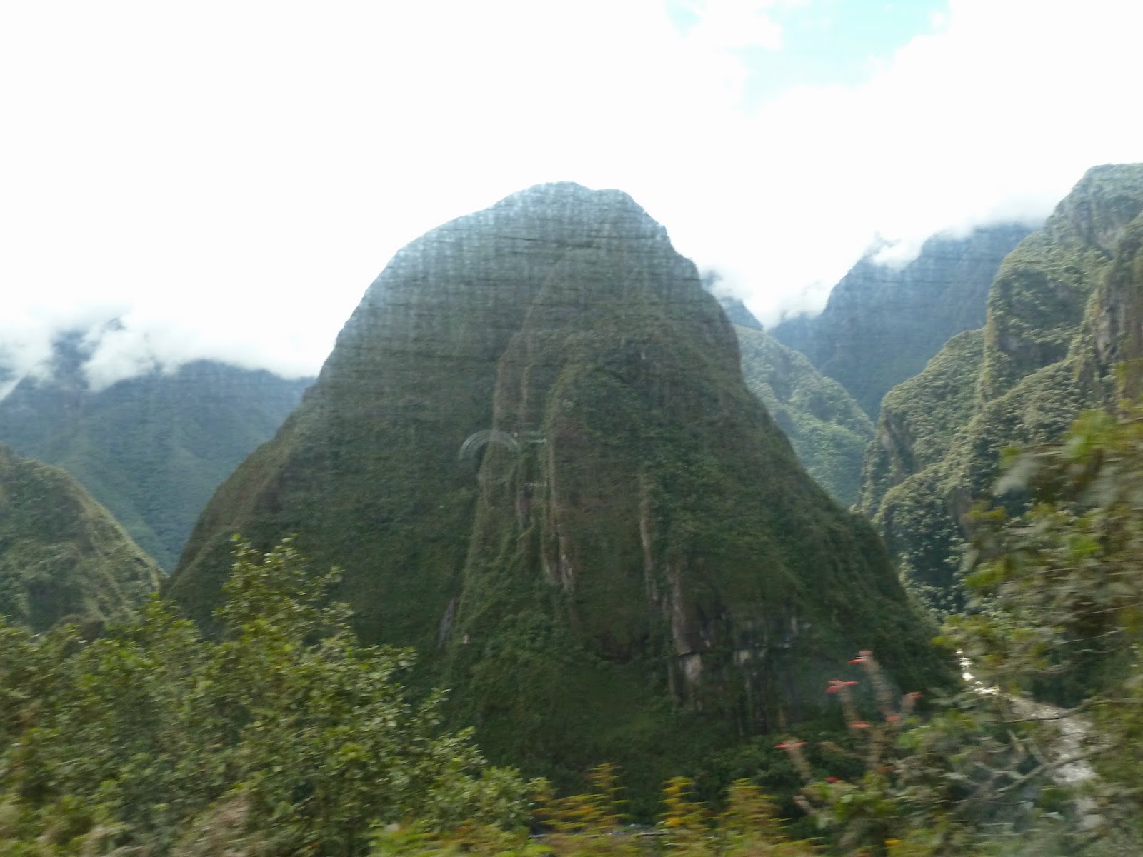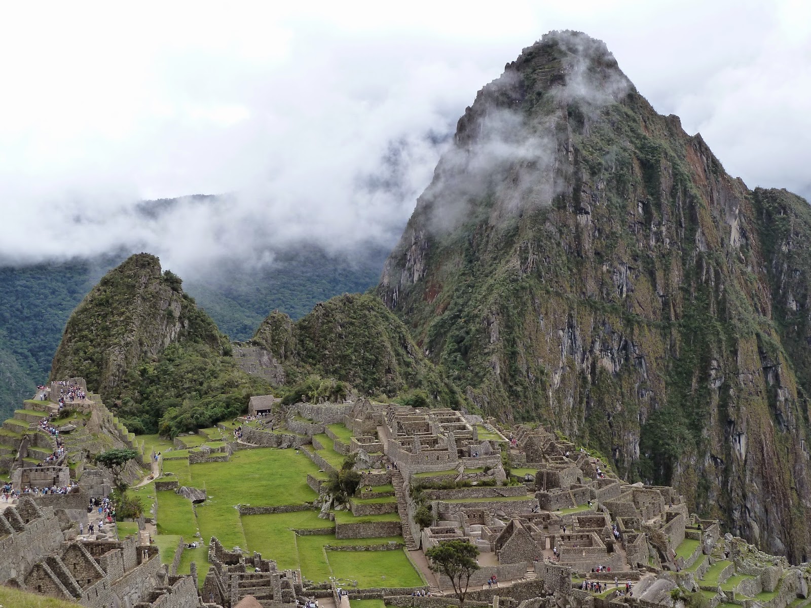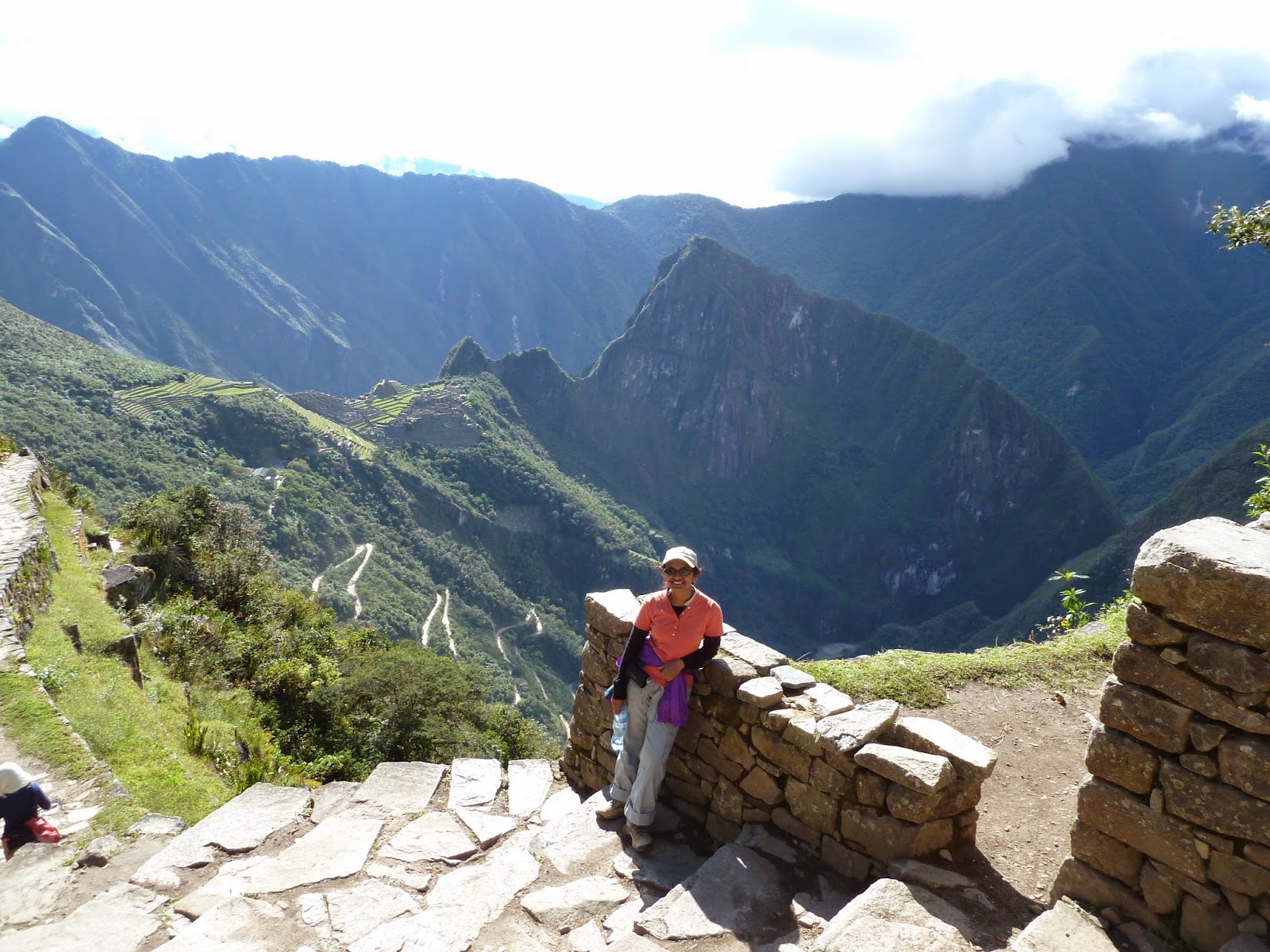 The climb was an hour and tiring as it was fully uphill. Walk was easy but going up hill in the heat was difficult. But the views were great. Here’s a picture with me and a Llama. Well, they are all over the place. I do have pictures of them roaming freely around Machu Picchu but this guy was on the trail on our way down from the Sun Gate. I must say that by the time you get to the Sun Gate, you can barely see Machu Picchu. It’s so far away but you are way up a mountain at that point. Machu Picchu looked small from way up there, but the views were great. I was glad to know that Huayna Picchu mountain hike was still not higher than where I went so I’m glad. No desire to climb Huayna Picchu. Would be too scary for me and being so steep I’m sure I’ll have a rough time up the mountain. In case you are wondering what Huayna Picchu is, well, it’s one of the mountains surrounding Machu Picchu and I’m told the hike is strenuous. After reading Trip Advisor reviews, I so badly wanted to do that hike and I had mentioned it to Boris. He told me to tell him if I still wanted to do the hike after I had hiked up Pisac mountain and I’ll have to re-read my blog on Pisac but that was a tough hike. I lost my desire for hiking up Huayna Picchu after Pisac. I knew the views would be brilliant but I wasn’t willing to risk it. I think there had been 7 deaths so far on the hike to Huayna Picchu and Boris talked about the day he was there and saw someone just fall off that mountain. He said, they had ropes now to hold onto as one climbed. No thank you! Anyway, Machu Picchu is called the City in the clouds because the mountains rise into the clouds and you see the tip of the mountain based on whether there’s a cloud or not. I am posting another picture of Machu Picchu with the low hanging clouds so you get an idea.